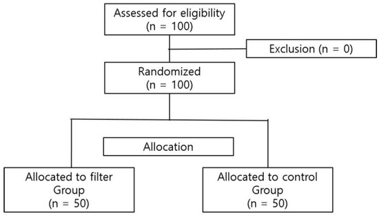 One hundred patients were assessed for eligibility. No patients were excluded. Therefore, 100 patients were randomized, with 50 patients allocated to the filter group and the other 50 allocated to the control group (Figure 2). All participants completed the intervention and there was no exclusion from analysis.