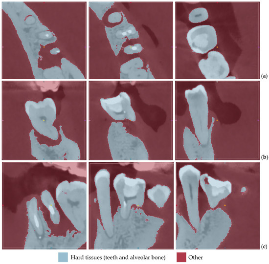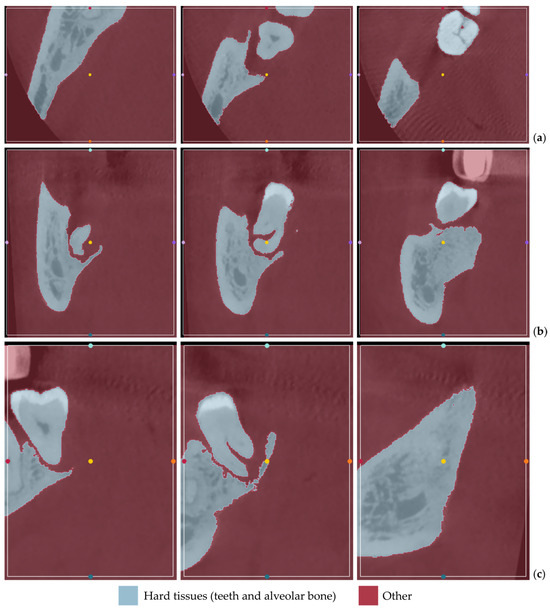 - Defining two segments: hard tissues (for the teeth and alveolar bone) and “other”, encompassing all the other regions of the oral system visible in the cropped CBCT images.