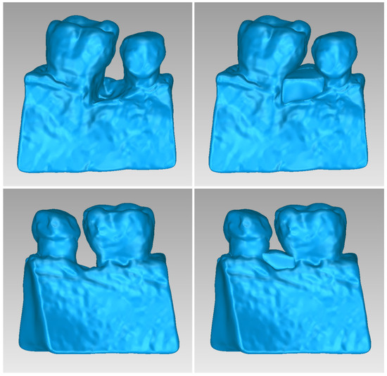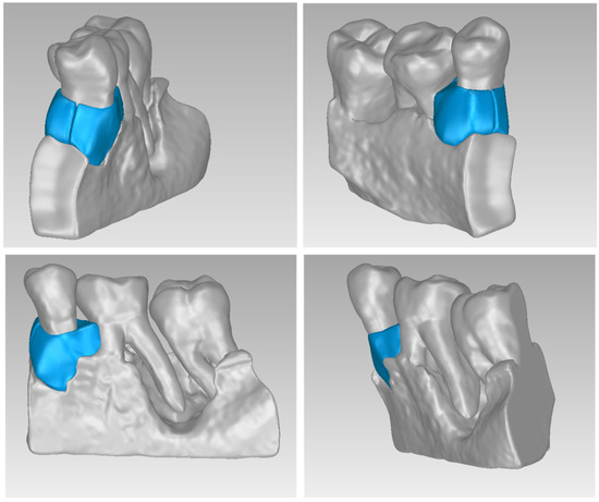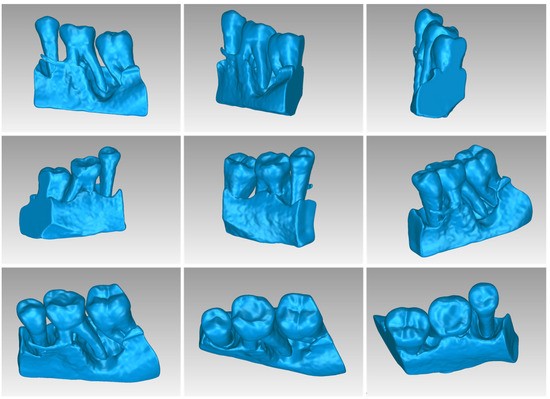Table 5 shows the number of triangles and the size of the 3D model of the alveolar bone and teeth surrounding the periodontal defect of Patient 2 before and after processing. The final 3D model of the hard tissues (after processing) is shown in Figure 14.