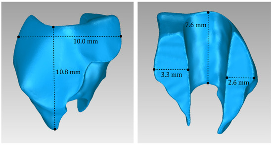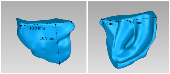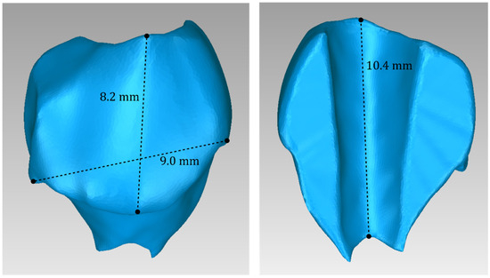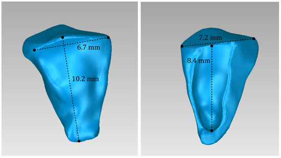 Two 3D models of scaffolds were designed for Patient 3, using the 3D representation of the hard tissues surrounding the periodontal defect. The 3D models of the two scaffolds, that were generated for Patient 3 following the approach discussed in Section 2.2, and their dimensions, are illustrated in Figure 25 and Figure 26. The volume of scaffold 1 of Patient 3 is 217.18 mm3, consisting of 41,648 triangles and corresponding to a size of 2.0 MB. The volume of scaffold 2 of Patient 3 is 113.40 mm3, consisting of 25,290 triangles and with a size of 1.2 MB. Views of the 3D models of the scaffolds designed for Patient 3 are presented in Figure 27. Figure 28 shows the 3D model of the periodontal defect of Patient 3 without the designed scaffolds (left) as well as with the 3D models of both designed scaffolds (right). Figure 29 showcases the 3D representation of Patient 3′s periodontal defect alongside the 3D models of the two designed scaffolds, all positioned within the same 3D space but viewed from various perspectives.