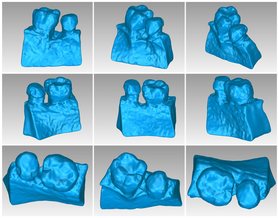 Final 3D model of hard tissues in the area of the periodontal defect of Patient 2, as seen from nine different viewpoints.