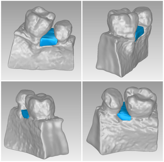 3D model of the periodontal defect of Patient 3 (grey) and 3D models of the generated scaffolds (blue), in the same 3D space from various perspectives.