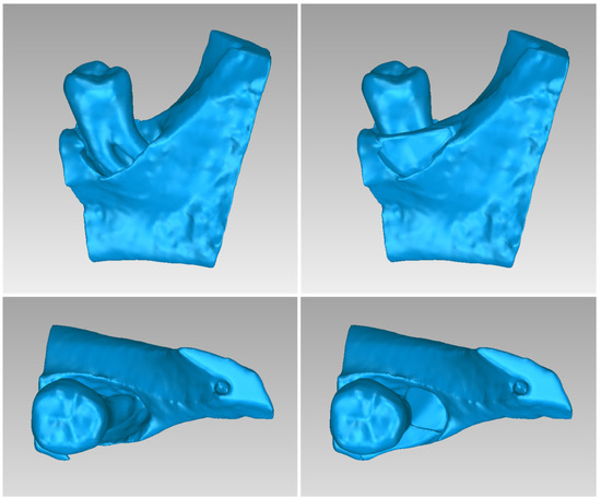 Figure 2 illustrates the 3D model of the hard tissues in the same 3D space from two distinct perspectives. The left image portrays the segmentation-derived 3D model before any processing, while the right image presents the same model after undergoing processing. Hence, Figure 2 clearly highlights the difference between the initial 3D model generated using segmentation and the refined final 3D model after processing. Thus, 3D-model processing, as proposed in the methodology summarized in Section 2.1, is deemed necessary.