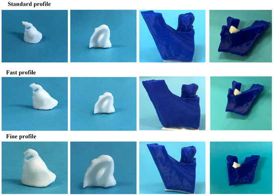 Figure 10 illustrates the 3D-printed scaffolds pertaining to Patient 1, produced utilizing the FDM 3D printer and employing the three distinct printing profiles. Upon comparative analyses of the scaffolds, those printed with the fast profile displayed diminished precision and quality. Additionally, when introduced into the periodontal defect, these scaffolds demonstrated a less-optimal fit compared to those printed with the standard and fine profiles.