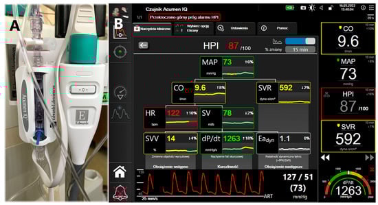 One of the methods to individualize the approach to hemodynamic management during anesthesia for elevated risk procedures to reduce the risk of intraoperative hypotension is using, beyond basic blood pressure measurements, advanced hemodynamic parameters such as stroke volume, stroke volume variation, cardiac output, and systemic vascular resistance. These parameters are derived in real-time from the shape and characteristics of the arterial waveform using proprietary algorithms []. In addition, applying The AcumenTM Hypotension Prediction Index software (number 02.03.000.103) (HPI) (Edwards Lifesciences, Irvine, CA, USA) for hemodynamic monitoring involves predictive analytics to foresee and prevent episodes of hemodynamic destabilization. It was developed using machine learning to predict arterial hypotension, defined as a mean arterial pressure (MAP) of less than 65 mm Hg for at least 1 min. Additionally, this technology identifies its causes, like hypovolemia, vascular resistance issues, or reduced cardiac contractility. It allows for early, tailored treatment, reducing the frequency and severity of hypotensive episodes. An intervention is recommended when the HPI reaches a threshold of 85 [,,,,].