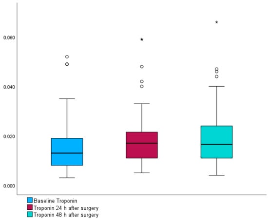 Preoperative and postoperative troponin levels. Boxplots illustrate the median and interquartile range (IQR) of troponin concentrations at baseline and 24 and 48 h after surgery. The whiskers extend to the furthest points within 1.5 times the IQR from the upper and lower quartiles, as per Tukey’s method. The asterisk (*) denotes outliers.