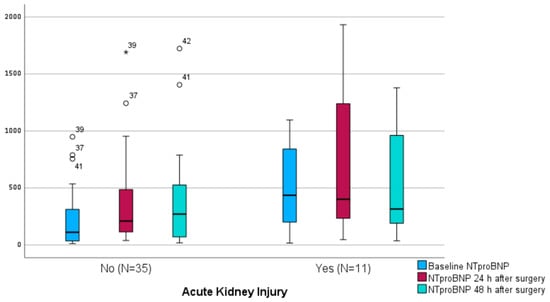 Preoperative and postoperative NtproBNP levels stratified by postoperative acute kidney injury. Boxplots illustrate the median and interquartile range (IQR) of NTproBNP levels at baseline and 24 and 48 h after surgery. The whiskers extend to the furthest points within 1.5 times the IQR from the upper and lower quartiles, as per Tukey’s method. The asterisk (*) denotes outliers.
