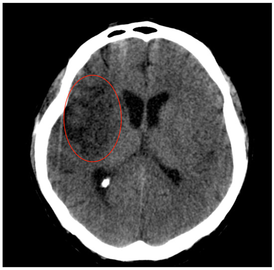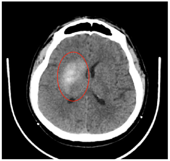 Head CT scan performed at 24 h after mechanical thrombectomy showed residual contrast substance in the nucleus basalis after revascularization—without established cerebral ischemia (red circle). The PC-ASPECTS was 10.