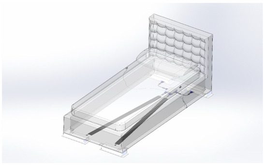 The Inoveris device is as intricate as the drivetrain of a four-wheel-drive electric car, employing high-quality silent servomotors—one for each leg. The apparatus comprises four modular supporting legs (Figure 1), a control unit that synchronizes leg motions, a remote control, two wired motion sensors to be affixed to the bed mattress, and a smartphone app for advanced control. The Inoveris device applies a slow, oscillating motion to the bed, facilitated by an integrated and programmable motion control system. The technology utilizes custom-manufactured electro-mechanical components to generate a gentle and nearly silent motion. Electrical specifications include a power consumption range (load-dependent) from 10 W to 20 W; a standby power consumption of <3 W; WIFI and Bluetooth connectivity; and an AC/DC power supply unit of 12 V, 80 W (Figure 2). Mechanical features encompass robust legs capable of supporting a bed, including occupants weighing up to 1000 kg/2200 lbs, a motion oscillation range of 4 cm/1.6”, and whisper-quiet 20 dBA actuators. The leg dimensions are 42 cm (L) × 13.3 cm (W) × 71.4 cm (H)/15.83 in (L) × 5.24 in (W) × 2.81 in (H), with a leg weight of 7.5 kg/16.5 lbs and a total leg weight for all four units of 30 kg/66 lbs (as shown in Figure 3).
