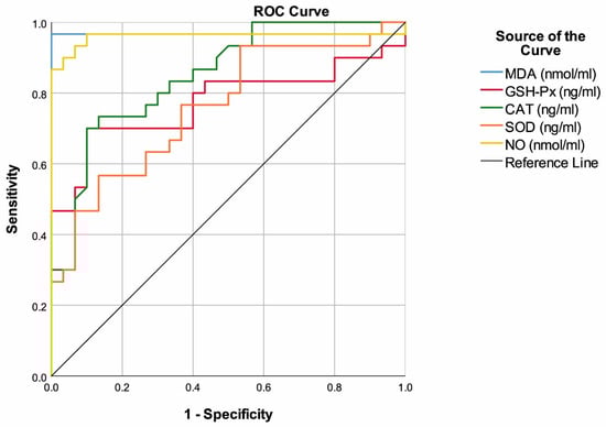 MDA with a cut-off value of >4.35 had 96.67% sensitivity and 100.00% specificity to predict multiple myeloma. Additionally, the highest area under the ROC curve was found for MDA (AUC: 0.967, 95% CI: 0.902–1.000, p < 0.001). GSH-Px with a cut-off value of <59.8 had 70.00% sensitivity and 90.00% specificity to predict multiple myeloma (AUC: 0.773, 95% CI: 0.645–0.901, p < 0.001). CAT with a cut-off value of <67.2 had 73.33% sensitivity and 86.67% specificity to predict multiple myeloma (AUC: 0.850, 95% CI: 0.755–0.945, p < 0.001). SOD with a cut-off value of <21.2 had 56.67% sensitivity and 86.67% specificity to predict multiple myeloma but also the lowest area under the ROC curve (AUC: 0.760, 95% CI: 0.639–0.881, p = 0.001). NO with a cut-off value of >38.5 had 96.67% sensitivity and 90.00% specificity to predict multiple myeloma (AUC: 0.960, 95% CI: 0.895–1.000, p < 0.001) (Table 2, Figure 1).