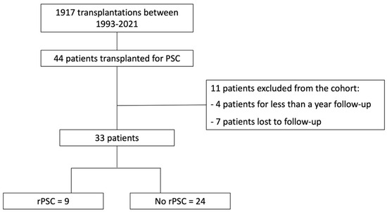 In the final analysis, as reported in Figure 1, 33 patients with PSC underwent LT, nearly equally gender-distributed, with a median age at transplant of 44 years.