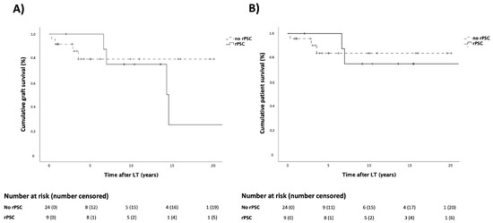 Figure 3. Graft (A) and patient (B) survival according to rPSC development.