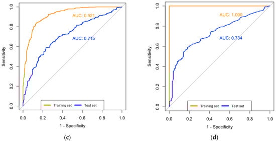 Model performance measured by the area under the receiver operating characteristic curve (AUC). (a) LASSO regression model including SNPs only. (b) LASSO regression model including SNPs and phenotype data. (c) Random forest model including SNPs only. (d) Random forest model including SNPs and phenotype data.