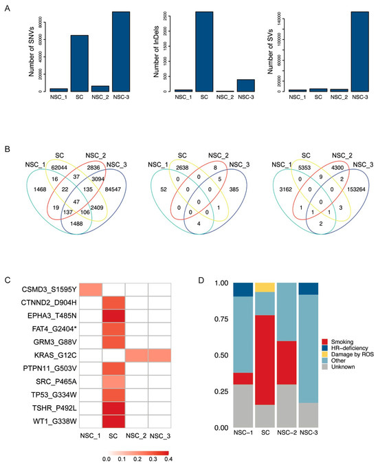 The NA WGS analysis of somatic variants revealed significant differences in mutational burdens across samples and between variant types. The SNV load was higher in NSC-3 (91,963) and SC (64,816) and much lower in NSC-1 (3303) and NSC-2 (6327). The InDel burden peaked in SC (2639), followed by NSC-3 (395), NSC-1 (56), and NSC-2 (13). The SV burden was highest in NSC-3 (153,274) and dropped in SC (5368), NSC-2 (4314), and NSC-1 (3167) (Figure 2A). The vast majority of somatic mutations were unique to each sample, with only 0.03% of SNVs common to all, suggesting that the primary lesions in the patient are genetically distinct and likely to have originated independently. The highest overlap of SNVs (1.95%) and InDels (0.16%) was seen between NSC-2 and NSC-3 (Figure 2B), which included a KRAS G12C mutation. TP53 was mutated in SC only (Figure 2C).