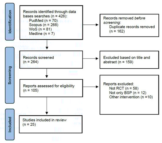 From a total of 426 search results, 264 studies were deemed suitable for inclusion after the removal of duplicates. Out of these 264 screened papers, 159 were discarded following the screening of the titles and abstracts. Upon the initial reading of all potential full texts, the Kappa score for the first and second reviewers was 0.9, indicating near-perfect agreement [23]. All of the 25 full-text articles that were evaluated for eligibility were ultimately incorporated into the synthesis [24,25,26,27,28,29,30,31,32,33,34,35,36,37,38,39,40,41,42,43,44,45,46,47,48] (Figure 1).