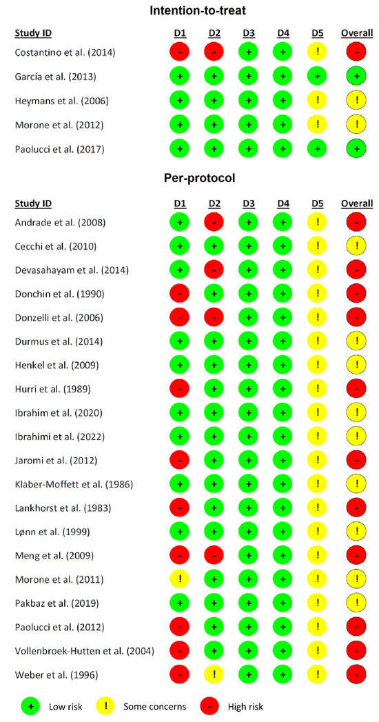 Risk of Bias. D1: process of random assignment; D2: discrepancies from the planned interventions; D3: absence of outcome data; D4: outcome measurement; D5: choice of the result that is reported [24,25,26,27,28,29,30,31,32,33,34,35,36,37,38,39,40,41,42,43,44,45,46,47,48].