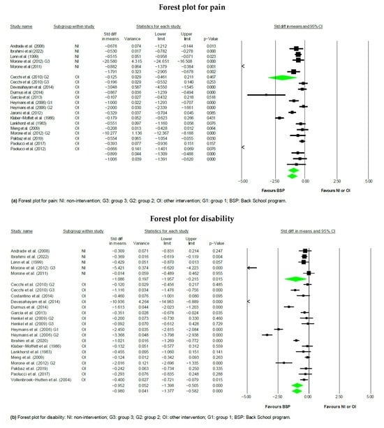 Forest plots: (a) Forest plot for pain [24,25,27,30,31,33,36,37,38,39,40,41,42,43,44,45,46] and (b) Forest plot for disability [24,25,26,27,29,30,31,32,33,35,36,38,39,40,41,42,43,44,46,47].