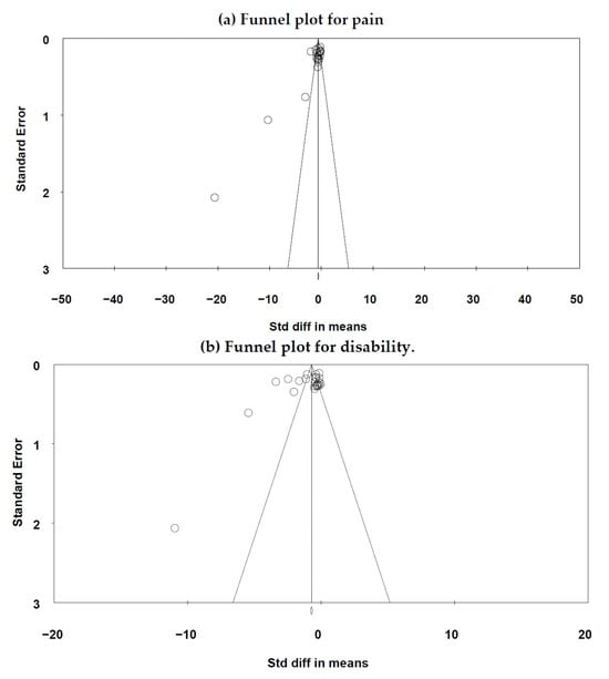 (a) Funnel plot for pain; (b) Funnel plot for disability.