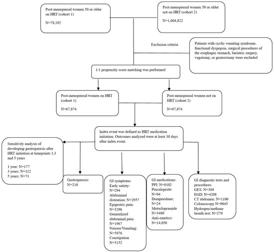 A retrospective cohort study was performed using the TriNetX platform, which included patients with at least some EHR-contributed information over a twenty-year span from 9 September 2003 to 9 September 2023. Post-menopausal women were included in this study, defined as women > 50 with at least one ICD encounter diagnosis of menopause. An age > 50 was chosen for the study group given the average age of menopause is 51 []. Patients of diverse racial and ethnic demographics were incorporated into this study. This included White, African American, Hispanic or Latina, Asian, American Indian or Alaska Native, and Native Hawaiian or Pacific Islander women. We divided our study group of post-menopausal women into two groups: post-menopausal women on HRT and post-menopausal women not on HRT. Hormone replacement therapy included the prescription drug classes of estrogen and progesterone. The index event was defined as the day of HRT initiation. The study outcomes included an ICD encounter diagnosis of gastroparesis at least 30 days after the index event. Secondary outcomes, including gastrointestinal symptoms, medications, diagnostic tests, and procedures, were examined 30 days after HRT initiation. These outcomes were identified based on diagnosis codes. Additionally, we performed a sensitivity analysis by analyzing the development of gastroparesis at 1, 3, and 5 years after the initiation of HRT.