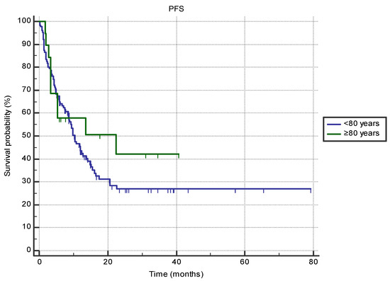 The difference in progression-free survival (PFS) between the groups of patients aged 80 or older (n = 19) and 70–80 (n = 126) treated with immune-checkpoint inhibitors in the first- or second-line setting (22.5 months, 95% CI 3.4–22.5 vs. 10.4 months, 95% CI 8.6–13.7, HR 0.76 (95% CI 0.42–1.38), p = 0.41).