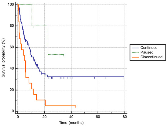 Discontinuation of the immunotherapy due to the adverse effects was associated with a shorter PFS compared to patients who did not have adverse effects requiring treatment interruption or who only paused immunotherapy before continuation (5.3 months (95% CI 13.3–8.6) vs. 11.8 months (95% CI 9.2–15.5) vs. not reached (95% CI n/a) p = 0.0005)) (Figure 2).