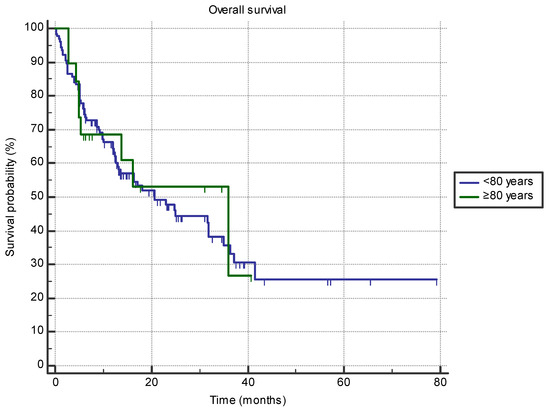 The difference in overall survival between the groups of patients aged 80 or older (n = 19) and 70–80 (n = 126) treated with immune-checkpoint inhibitors in the first- or second-line setting (35.9 months (95% CI 5.3–35.9 months) vs. 20.7 months (95% CI 13.2–31.9 months); HR 0.9, p = 0.79).