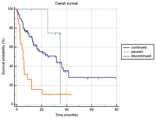 The difference in overall survival between the patients who permanently discontinued immunotherapy due to adverse effects (n = 19), patients who had a treatment pause with subsequent continuation of immunotherapy (n = 5), and patients who continued treatment with no significant adverse effects (n = 121) (5.3 months vs. 35.0 months vs. 31.6 months, p < 0.0001).