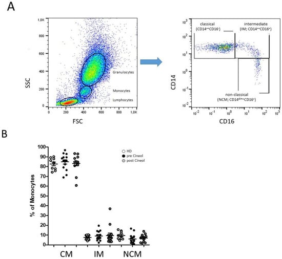 We analyzed the percentages of CD14++CD16− (classical), CD14++CD16+ (intermediate), and CD14dim+CD16+ (non-classical) monocyte subsets in the peripheral blood of COM patients (n = 14) prior to and 14 days after 1,8-Cineol administration, and compared the results with healthy donors (n = 10). The gating of flow cytometric measurements of CD14- and CD16-defined monocyte subsets was carried out according previously published methods [26].