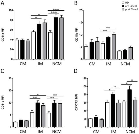 Flow cytometric analysis of monocytic adhesion molecules: (A) CD11a, (B) CD11b, (C) CD11c, and (D) CX3CR1 on classical (CM; CD14++CD16−), intermediate (IM; CD14++CD16+), and non-classical (NCM; CD14dim+CD16+) monocytes from COM patients before (pre) and after (post) 1,8-Cineol administration compared to healthy donors (HD). *: p < 0.05; **: p < 0.01; ***: p < 0.001. MFI: mean fluorescence intensity.