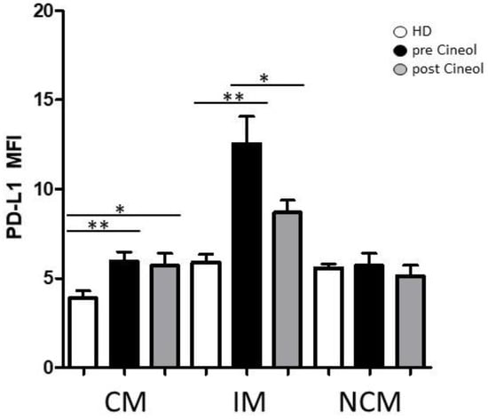 Flow cytometric analysis of checkpoint molecule PD-L1. PD-L1 expression on CD14/CD16 monocyte subsets (CM: classical monocytes; IM: intermediate monocytes; NCM: non-classical monocytes) from COM patients was measured before and after 1,8-Cineol administration and compared to healthy donors (HD). *: p < 0.05; **: p < 0.01. MFI: mean fluorescence intensity.