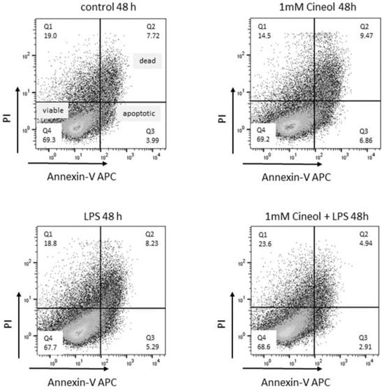 Cells of the human monocyte leukaemia cell line THP-1 were treated with 10 ng/mL lipopolysaccharide (LPS) and/or 1 mM 1,8-Cineol for 24 h. Propidium iodide (PI) and Annexin V-APC staining revealed no cytotoxic effects on the cellular viability (Figure 4).