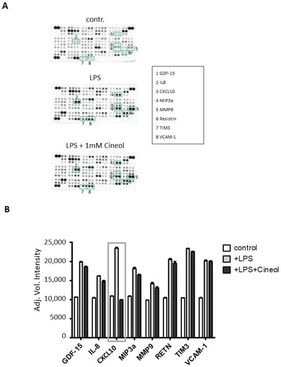 Semiquantitative analyses were performed by measuring the density of the dots and these revealed differential secretion patterns of certain cytokines in response to LPS treatment in the presence and absence of 1,8-Cineol compared to the control (Figure 5A). Overall, the data revealed increased secretion patterns of different cytokines (GDF-15, IL-8, MIP3a, MMP9, RETN, TIM3, VCAM-1) in response to LPS stimulation compared to the medium control with 1,8-Cineol having slightly reducing effects (Figure 5). In this context, cytokine CXCL10 is particularly striking, because its increased secretion in response to LPS was found to be strongly attenuated by 1,8-Cineol (Figure 5B).