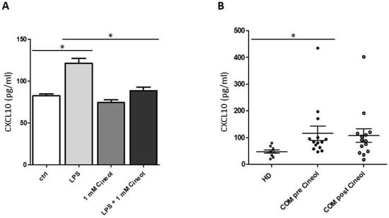 Furthermore, plasma levels of CXCL10 were analyzed in our patient cohort before and after 1,8-Cineol administration and these were compared to healthy donors (Figure 6B). The data revealed heterogeneous but significantly increased levels of plasma CXCL10 in COM patients before 1,8-Cineol administration compared to healthy donors. Post 1,8-Cineol, we could detect a decrease in CXCL10 secretion levels in COM patients (1,8-Cineol-responder), but this was quite heterogeneous and overall not significant between the pre and post 1,8-Cineol situation (Figure 6B).