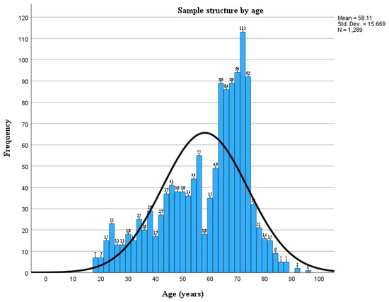 The sample has a non-normal distribution for age (Figure 1), as confirmed by testing for normality, with a difference between the mean (58.11 years) and median (63.00 years), skewness to the left (skewness coefficient −0.686), a lower peak around the mean and a Kolmogorov–Smirnov test and Shapiro–Wilk test significance of <0.001.