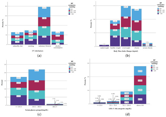 More than half of the subjects reporting a sedentary lifestyle (54.14%) had SBP values ≥ 140 mmHg, and 87.12% of the subjects with SBP values corresponding to stage II hypertension (SBP ≥ 140 mmHg) had a BMI above the normal BMI values. Also, two out of three subjects with grade II hypertension recorded plasma glucose levels > 100 mg/dL, and approximately two-thirds of the subjects had serum LDL-C values > 100 mg/dL irrespective of the SBP classification of normal, elevated or hypertension grades.