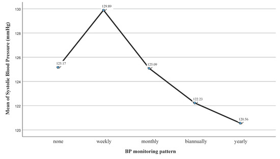 A one-way analysis of variance was conducted to evaluate the null hypothesis that there is no difference in the systolic blood pressure values (mmHg) of the subjects based on their BP monitoring patterns (N = 1289). The independent variable, BP monitoring patterns, included five groups: weekly (M = 129.89; SD = 19.4; n = 539), monthly (M = 125.09; SD = 18.17; n = 283), biannually (M = 122.23; SD = 18.50; n = 174), yearly (M = 120. 56; SD = 18.85; n = 216) and never (M = 125.17; SD = 18.81; n = 77). The assumption of normality was evaluated using histograms and found to be tenable for all groups. The assumption of the homogeneity of variances was tested and found to be tenable using Levene’s test: F (4,1284) = 0.302 and p = 0.877. There was a significant difference among the patterns of BP monitoring according to the SBP measurements (F (4,1284) = 12.10; p < 0.001; partial eta squared: 0.036), thus demonstrating the significant differences in SBP (mmHg) based on BP monitoring patterns (Figure 4). Post hoc comparisons (Tukey’s HSD test, tenable equal variances) were conducted to evaluate pairwise differences among the group means. The tests exposed significant pairwise differences between the mean scores of SBP monitored weekly and the mean scores of SBP monitored monthly (p = 0.005), biannually (p < 0.001) and yearly (p < 0.001).