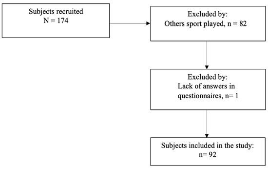 Participants were recruited on a voluntary basis from the general population and through contact with rugby players and clubs. The subjects were recruited online through platforms such as social media and email, and completed the questionnaires online. The study focused on adult subjects aged 18 years or older who have participated in sports at a competitive or amateur level, either currently or in the past. From the initial sample of 174 individuals, 92 rugby athletes were identified and included in this study. It is worth noting that only one subject was excluded due to incomplete questionnaire responses. For further details on the inclusion criteria, please refer to Figure 1.