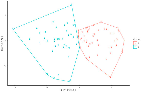 Cluster plot depicting the two groups of rugby players extracted by k-means cluster analysis (i.e., group 1, in red; group 2, in blue). The majority of the variance is likely explained by the first two principal components, which are utilized to plot the data points. The first dimension explains 43.5% of the variance, while the second dimension explains 22.7% of the variance. The two dimensions were identified following a principal component analysis automatically performed by the R function fviz_cluster.
