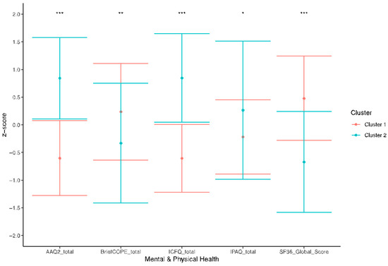 Scatter plot representing the means ± standard deviation of the standardized scores obtained by the two groups of rugby players yielded by the k-means cluster analysis. The variables considered are as follows: weekly physical activity (IPAQ_total), cognitive inflexibility (AAQ2_total), coping strategies (BriefCOPE_total), cognitive fusion (ICFQ_total), and general health (SF36_Global_Score). * = p < 0.05; ** = p < 0.01; *** = p < 0.001.