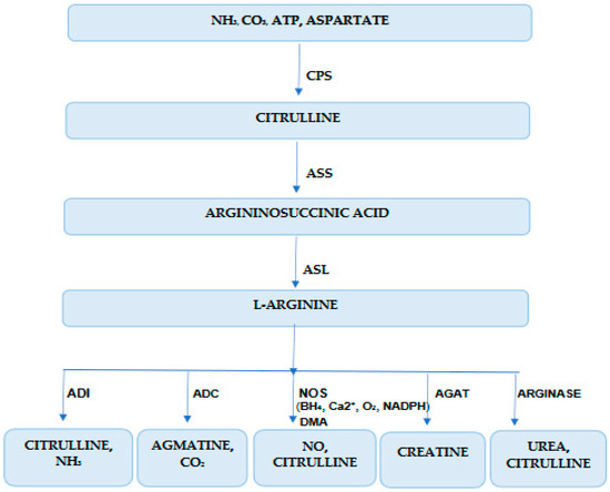 - Szefel, J.; Danielak, A.; Kruszewski, W.J. Metabolic pathways of L-arginine and therapeutic consequences in tumors. Adv. Med. Sci. 2019, 64, 104–110. [Google Scholar] [CrossRef] [PubMed]
