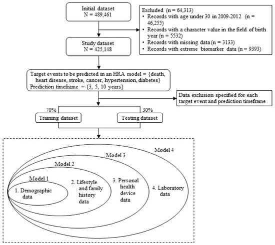We designed this study to evaluate whether including predictor variables with higher acquisition costs improves the predictive accuracy of HRAs for the personalized prediction and prevention of adverse health events. We systematically introduced groups of variables one at a time (Models 1–4 in Figure 1) to assess the incremental predictive accuracy gained by adding the groups of variables to the models. Conceptually, the data acquisition costs reflect the financial and logistical burden associated with obtaining the data, as well as the discomfort and inconvenience experienced by individuals during the acquisition process. We posited that acquiring laboratory data would be the most resource-intensive and cumbersome process due to the need for individuals to undergo procedures involving needles and blood extraction [34]. Considering the significantly different characteristics between male and female datasets (Table 1 and Table 2), we conducted separate analyses for each gender.