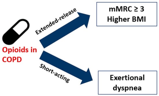 As proved by the studies presented above, the use of opioids proved beneficial as an intervention for refractory dyspnea in certain individuals with advanced COPD. A noteworthy number of patients sustained these benefits for months, aligning with recent suggestions to contemplate the use of opioids in certain subgroup of patients with different phenotypes (higher BMI; mMRC ≥ 3) or outcomes (exertional dyspnea), as presented in Figure 1.