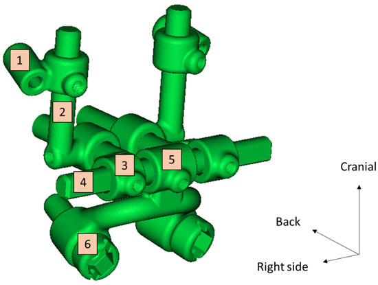 Experimental prototype file of PirifixTM. 1: Right paranasal bone support; 2: right vertical axis; 3: right anteroposterior axis; 4: transverse axis; 5: inverted U-shaped part; 6: right maxillary bone support.