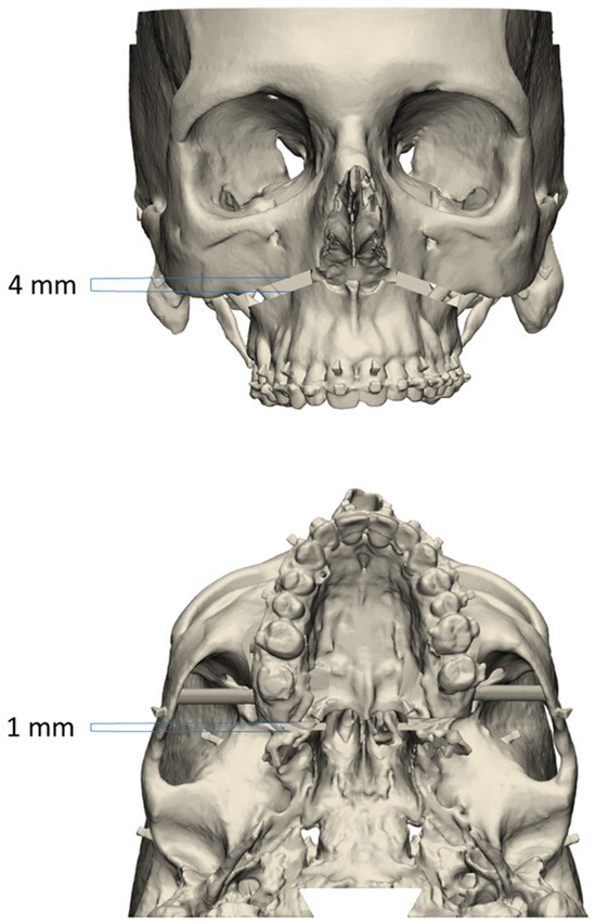 Sixteen pairs of hooks were placed on each model. Six pairs reproduced orthodontic brackets. They were placed on the necks of the medial incisors, canines, and first premolars. Two pairs reproduced the resistance of the palatal mucosa. They were placed on the medial pterygoid processes and the posterior palate. Two pairs reproduced the temporomandibular joint capsule. They were placed on the base of the zygomatic arch and the condylar neck. Six pairs reproduced the muscular traction of the masseter, temporal, and medial pterygoid muscles. They were placed at their respective insertions (Figure 3).