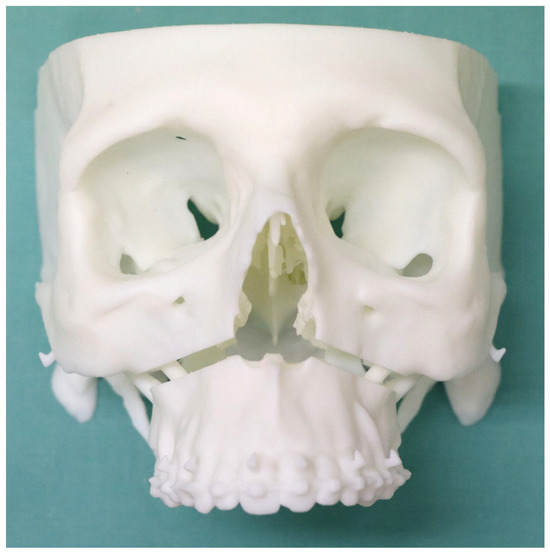 Stereolithography was used with Preform software (Formlabs, Somerville, MA, USA) and a Form2 or Form3+ printer (Formlabs). The models were printed on a 1:1 scale with white resin (Figure 6), while the splints were printed with white, color base, or clear resin. The supports were manually removed. After, the models needed to be cleaned with a 20 min long isopropanol bath in FormWash (Formlabs) and they were then polymerized for 1 h with FormCure (Formlabs). Two copies of each model were printed. Each copy was assigned to one of two surgical groups: the control group (positioning by occlusal splint) and the PirifixTM group. The splints were printed using the same protocol as the experimental models and were assigned to the control group.