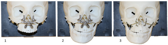 Each UDA was then positioned according to the objectives set. Osteosynthesis was performed using modus 2 screws and titanium plates (Medartis, Basel, Switzerland). Positioning and osteosynthesis were performed twice per model. The first time, the UDA had to come back to its initial position. The second time, the UDA had to be positioned as the corrected and planned model. In each group, the vertical adjustment was set with a caliper in planned distances between the canine hooks and orbital rims.