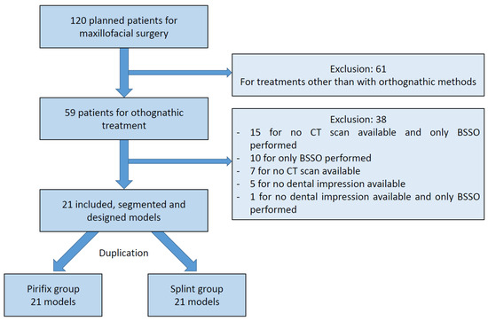 No data were available in the literature to estimate the expected difference in accuracy between PirifixTM and occlusal splints. The number of subjects required could not be determined. Data were analyzed using R statistical v4.2.2 (The R Foundation for Statistical Computing, Vienna, Austria). The mean difference between the models of the two groups and the planned models was compared. Analysis was performed by applying a Student’s t-test or Wilcoxon Mann–Whitney test, depending on the number of models considered and variable distribution. Analyses were conducted as a two-sided test with 95% confidence intervals. The mean difference was considered significant if the p-value was less than 0.05.