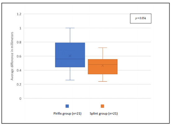 For the P0 position, the accuracy was 0.47 mm and 0.60 mm for the splint group and the PirifixTM group, respectively (p = 0.054) (Figure 9). For the corrected position, the accuracy was 0.69 mm and 0.84 mm for the splint group and the PirifixTM group, respectively (p = 0.036) (Figure 10 and Figure 11). In the PirifixTM for C positioning, 81.0% of models had an error in the vertical dimension, 61.9% in the sagittal dimension, and 66.7% in the horizontal dimension. In the splint group, this was 47.6%, 38.1%, and 76.2%, respectively.