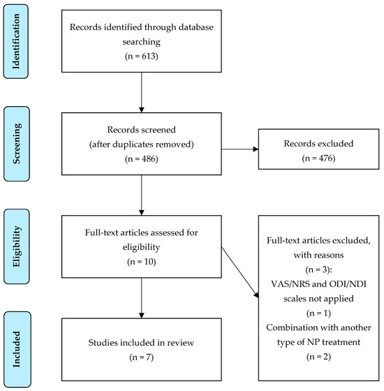 Two RCTs and five non-randomized observational studies were found. Both RCTs focused on the treatment of neck MPS. Two observational studies (prospective and retrospective) investigated intradiscal O2-O3 nucleolysis in patients with cervical HD. Three observational studies (one prospective and two retrospective) dealt with the paravertebral intramuscular application of O2-O3 mixture in patients with NP. The study selection flowchart is marked in Figure 1. A summary of the data from the evaluated studies is shown in Table 1.