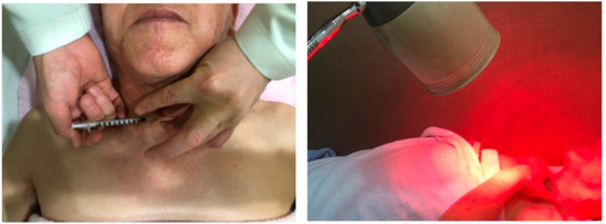 During the procedure, 0.2 mL of MOK was injected on either the left or right side of the Shuitu (ST10), which is near the thyroid gland. The left and right sides were alternated at each visit. Infrared irradiation was administered using a lamp for 10 min while manually pressing the procedure area (Figure 1).
